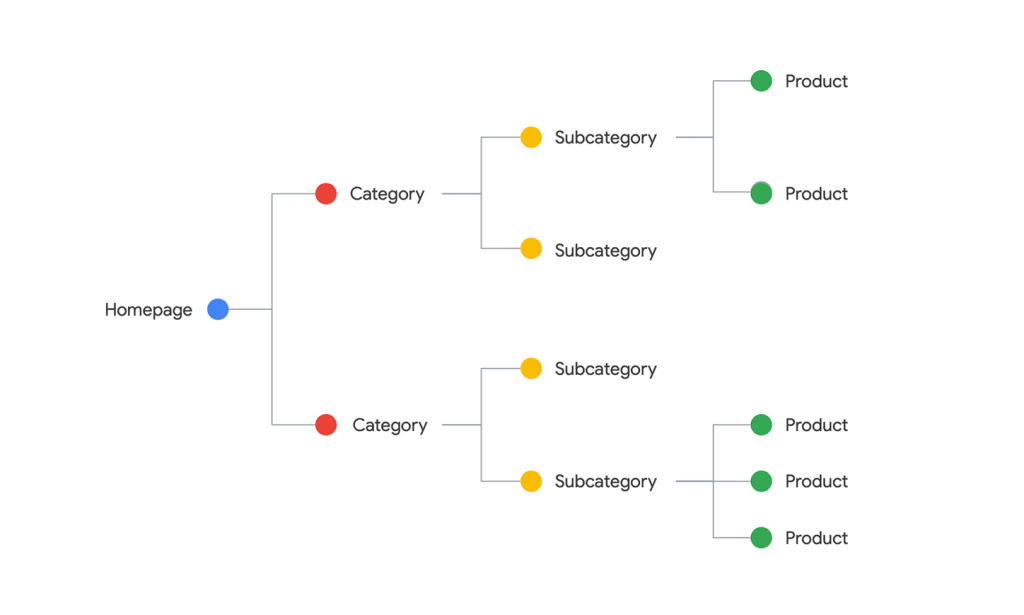 Aquí hay un ejemplo de organización de la jerarquía de un sitio web de comercio electrónico, comenzando con la página de inicio y luego conduciendo a tres niveles de subpáginas: páginas de categorías, páginas de subcategorías y páginas de productos.
