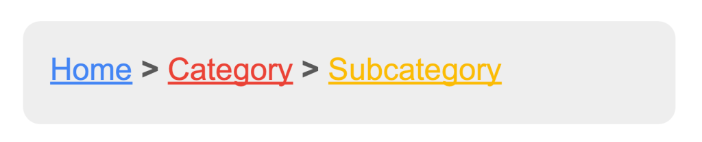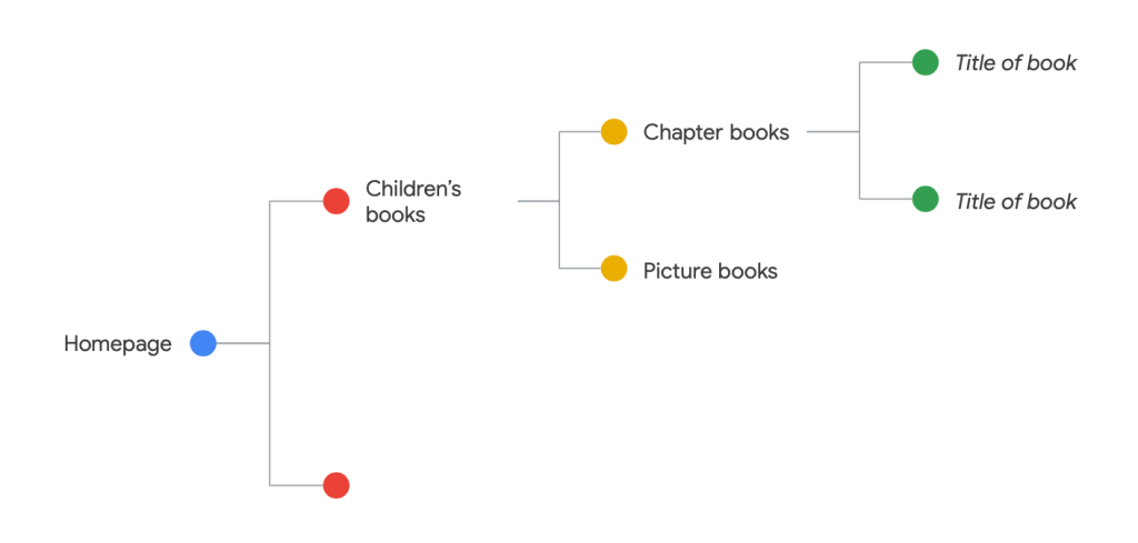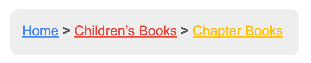 Por ejemplo, las breadcrumbs de la librería comenzarán con la página de inicio, luego incluirán un enlace a la página de la categoría (libros infantiles) y terminarán con un enlace a la página de la subcategoría (libros de cuentos) como muestra el siguiente gráfico: